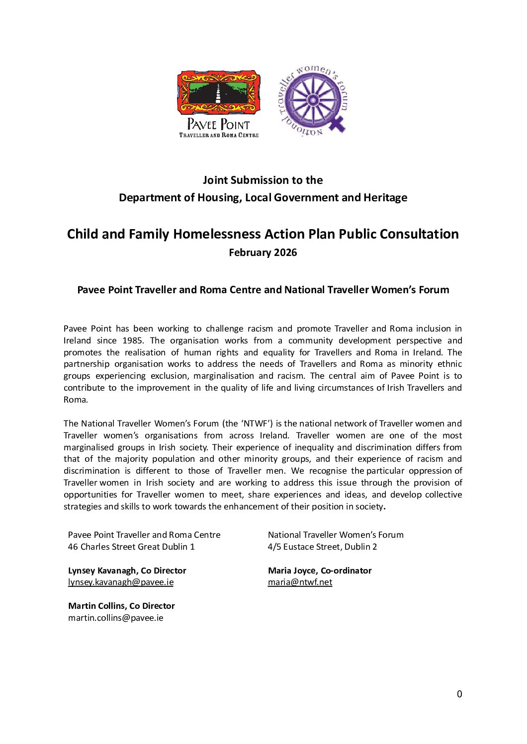 ![]() | Joint Submission to the Department of Housing, Local Government and Heritage: Child and Family Homelessness Action Plan Public Consultation | Accommodation, Children, Family Support, Roma, Submissions | 11 February 2026 | accommodation children family-support roma submissions | |